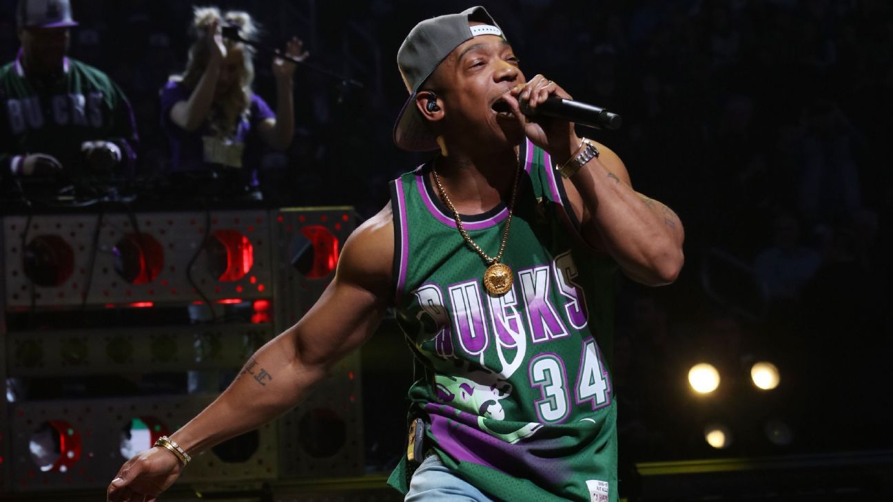 Another video shows Bucks star Giannis Antetokounmpo taking warm-up shots while Ja Rule was still performing.
