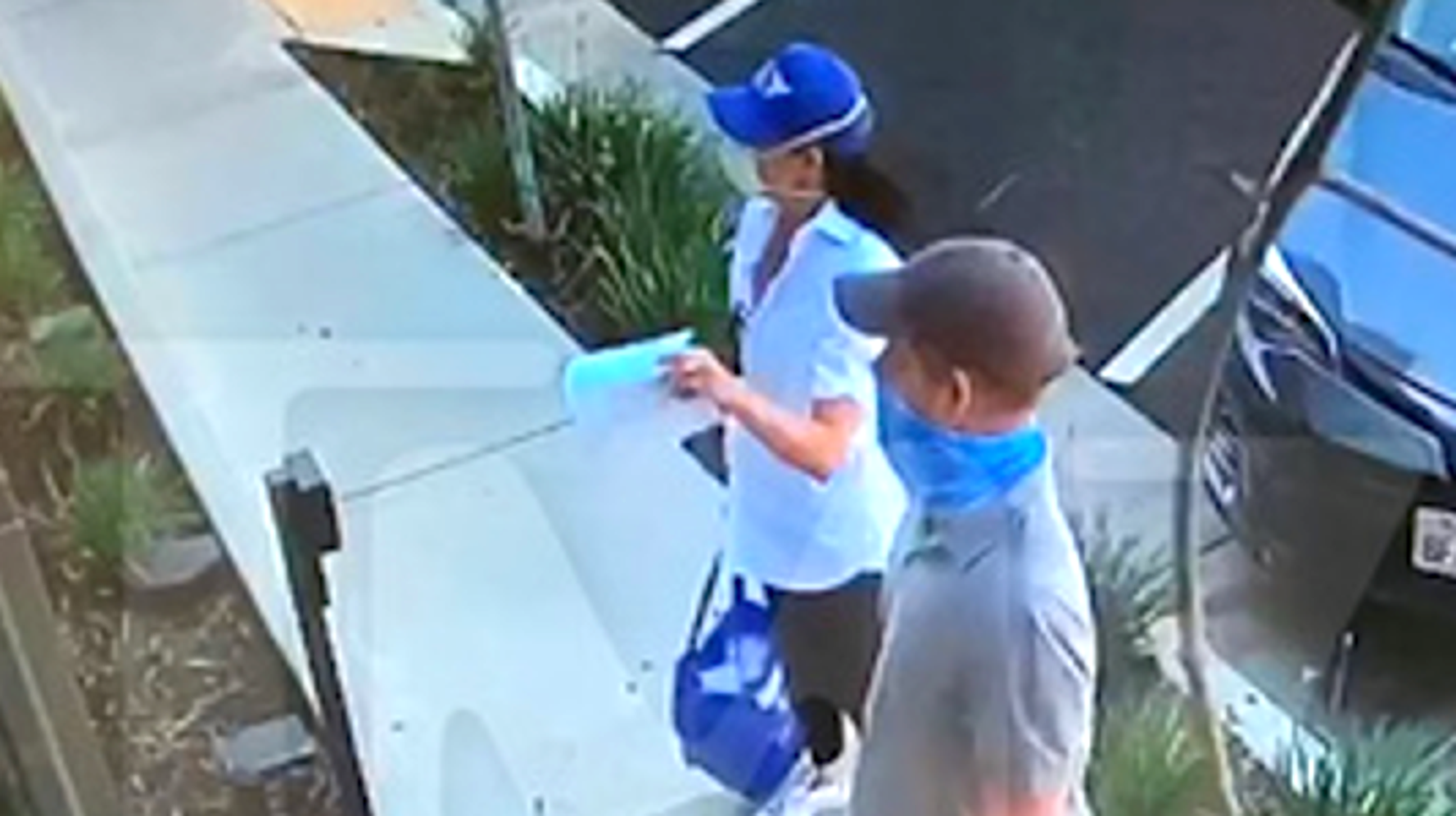 The footage, shared by TMZ on Thursday, showed the pair in baseball caps and face coverings being buzzed in at an apartment complex a day earlier. They then climb the stairs to make the delivery.