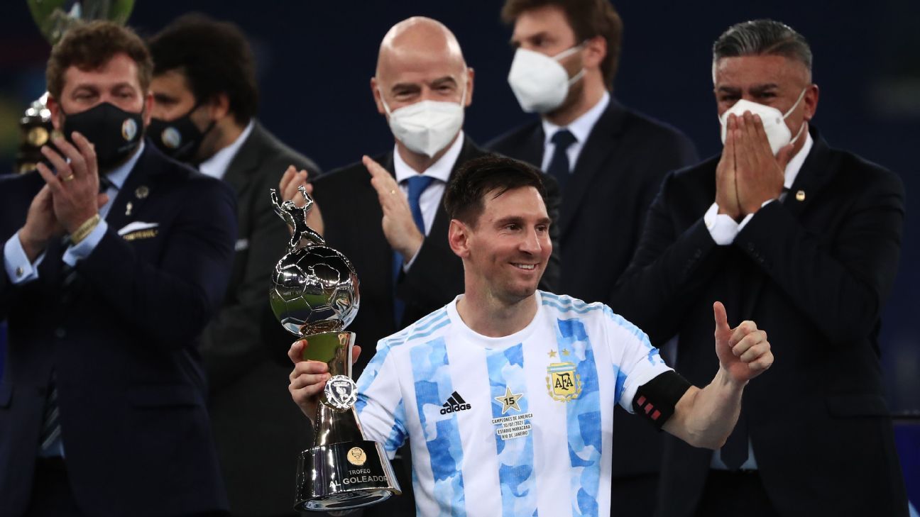 Messi was named the Player of the Tournament at the Copa America and shared the competition's Golden Boot with Colombia's Luis Diaz. Both players scored four goals. Messi also laid on five assists.