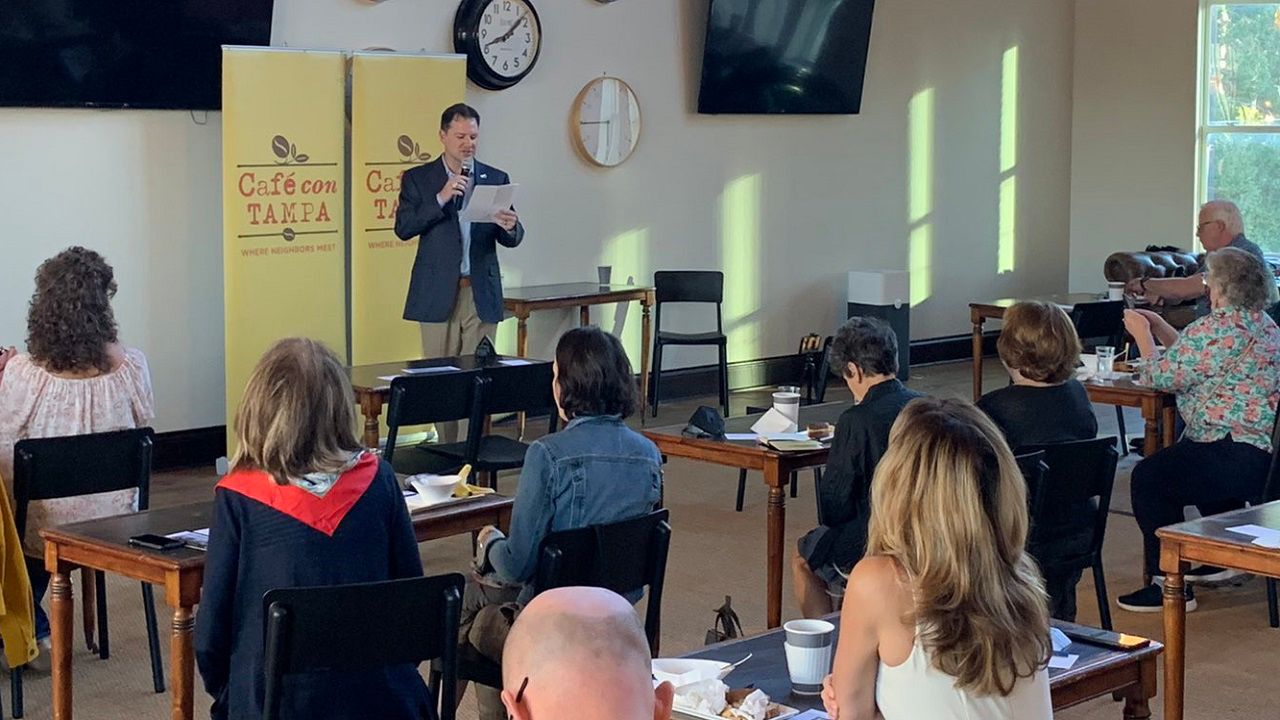Rays Baseball President Brian Auld spoke at Café Con Tampa on Friday, a weekly community event. He was promoting the idea of a sister city partnership with Montreal.